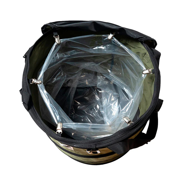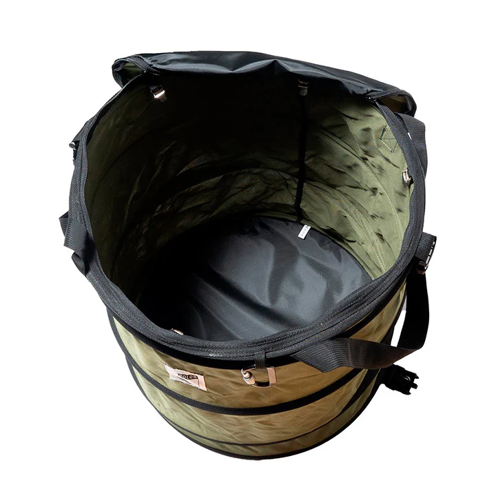 市販の45Lゴミ袋にピッタリな大型サイズのトラッシュボックス。中で分別もできるゴミ袋固定用フック6か所付きで使い勝手バツグン。コンパクトに収納可能なので、持ち運びも便利。家ではランドリーボックスなどとしても。