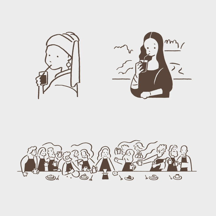コーヒーを題材に、シンプルで温かみのあるタッチの作品を描き続けるイラストレーター「COFFEE BOY」とリバーズが初のコラボレーション。コーヒーを楽しむ「真珠の耳飾りの少女」(フェルメール)、「モナリザ」、「最後の晩餐」(いずれもレオナルド・ダ・ヴィンチ)の登場人物たちと、ホッとひと息ついてみませんか?