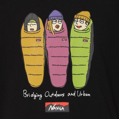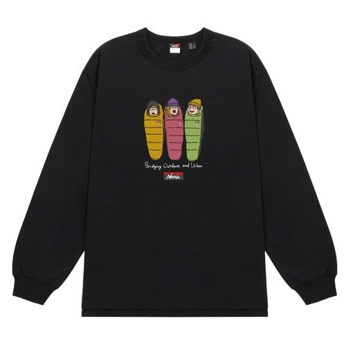 ナンガの寝袋に入って語らう三人組を描いた、遊び心あふれるロングスリーブTシャツ。