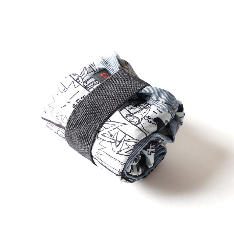 小さくたたんだ上で内蔵の平ゴムを巻き付けるとコンパクトに収納出来ます。大小2サイズ展開で、こちらはコンビニ弁当などを収めるのに丁度よいサイズ感になります。